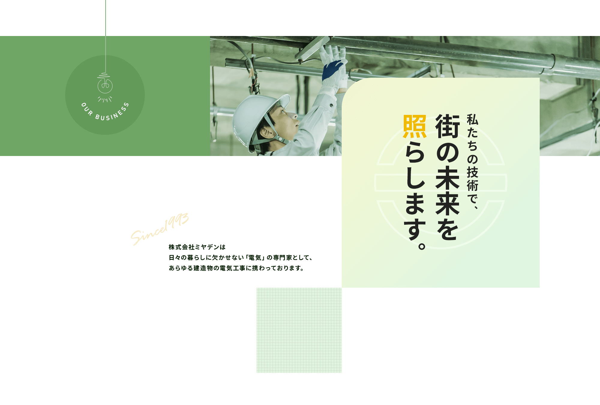 大阪府東大阪市に本社を構える株式会社ミヤデンは、関西一円及び関東一円で電気工事、電気設備工事を手がける会社です。店舗や商業ビル、オフィスビル、マンション、教育施設、福祉施設、ホテルなど、あらゆる建物の新築工事・リニューアル工事に対応し、お客様のご要望に合わせた最適な施工プランで、安心・安全な電気設備の構築に努めております。